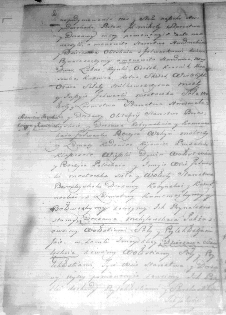 „Oznaymuiem tym naszym Listem wsym pospolitio y kazdemu z osoba niniejszym i napotym będoczym komu by taka potrzeba byla (…) Iż Posłowie od wszych stanów Wielikogo Kniastwa Lit[ewskiego] tak z rady iako y z Rycestwa (…) potrobu byly baczoczy oby stol Hospodarki Także y Skarb Zemski W. Kniazt. Littm pewnymi Dochody byl opatron kotorych by ne tolko Podskarby Zemski ale ani my Hospodar (tytuł używany przez Wielkich Książąt Litewskich) y po nas Buduczyie Ich miłst Kroli Polskio y Wielkiio Kniazi Litowskije Tych Dochodów nikomu oddawały (…) Przetoz Ich Milsty Starostwa y Derzawy nizey pomononyich nato naznaczyli, a manowite Starostwo Horodenskie (grodzieńskie) y Dzierzawa Olitskaia (dzierżawę olicką) z folwarkami knimi Przynalezaczymy a menowite Horodnic[a], Nowy Dwor, Labno, Krynki, Odelsk, Krasnik, Kwasowka, Kuznica, Kotra, Skidel, Wirtieliszki, Oziera [,] Sałaty, Milkowszczyzna [,] Mosty y Inszyie Folwarki [,] mosteczka (miasteczka) Sola (wsie) [,] Włosty (włości) y Lesnictwa Starostwa Horodensko y Derzawy Olitskiey [.]”