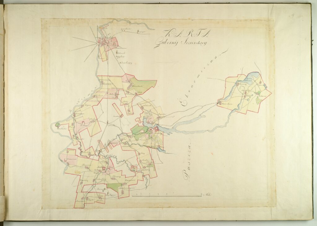 Rys. 1. Obszar guberni jezierskiej współtworzącej ekonomię grodzieńską ok. 1795 r.. Źródło: AGAD, Zbiór kartograficzny, sygn. 66-3, s. 4. http://agadd2.home.net.pl/metrykalia/402/album/66-3/index.html#img=PL_1_402_66-3_IV.jpg